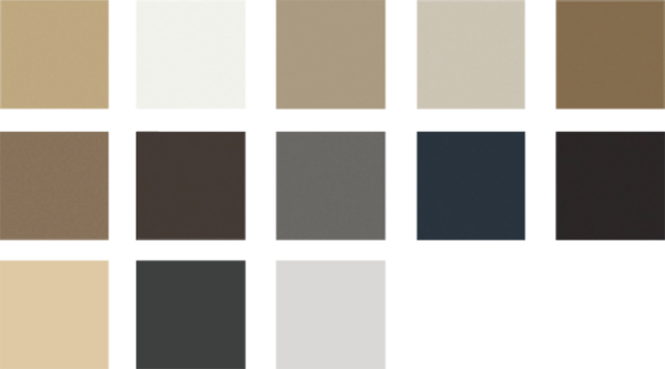 Цвет | Антрацит, Бежевый, Белый, Бледно-коричневый, Каменный, Каменный серый, Светло-бежевый, Серебристый, Серый бежевый, Средне-коричневый, Темно-коричневый, Темно-синий, Черный |